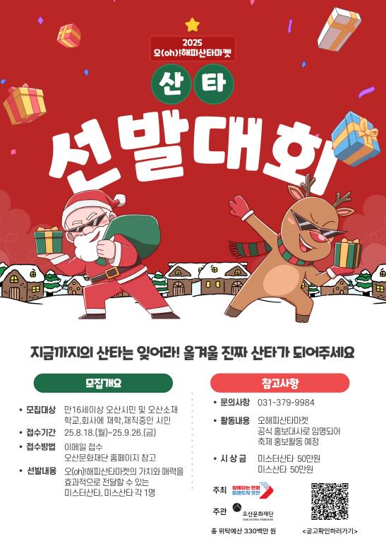 신선교 오산문화재단 대표이사는 “이번 산타 선발대회는 단순한 인물 선발을 넘어, 시민과 함께 오산의 겨울 문화를 만들어가는 특별한 축제의 출발점”이라며 “많은 시민들의 적극적인 참여를 기대한다”고 말했다.