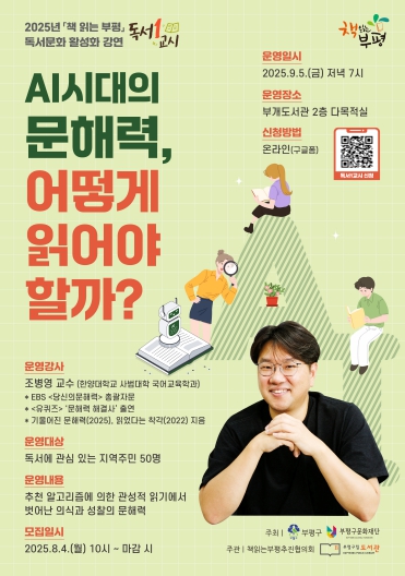 부평구민의 보편적 독서 역량 강화와 독서문화 확산을 위한 ‘독서1교시’는 21세기 인공지능시대의 필수 역량인 ‘비판적 문해력’과 관성적 읽기를 벗어난 ‘의식과 성찰의 문해력’을 키울 수 있도록 마련됐다.