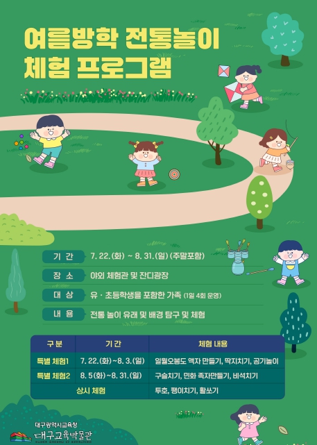 기간 중, 7월 22일부터 8월 3일까지는 ▲일월오봉도 액자 만들기, ▲딱지치기, ▲공기놀이 등이, 8월 5일부터 31일까지는 ▲구슬치기, ▲민화 족자 만들기, ▲비석치기 등이 각각 운영된다.