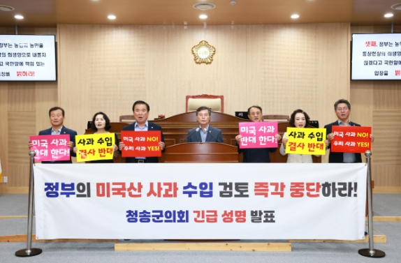 청송군의회는 심상휴 의장을 포함한 전체 의원 명의의 성명서를 통해 ‘미국산 사과 수입이 현실화 될 경우 도내 사과생산농가는 물론, 국내 과수 산업 전체가 회복 불가능한 타격을 입을 것’이 라는 강한 우려를 표명하고,