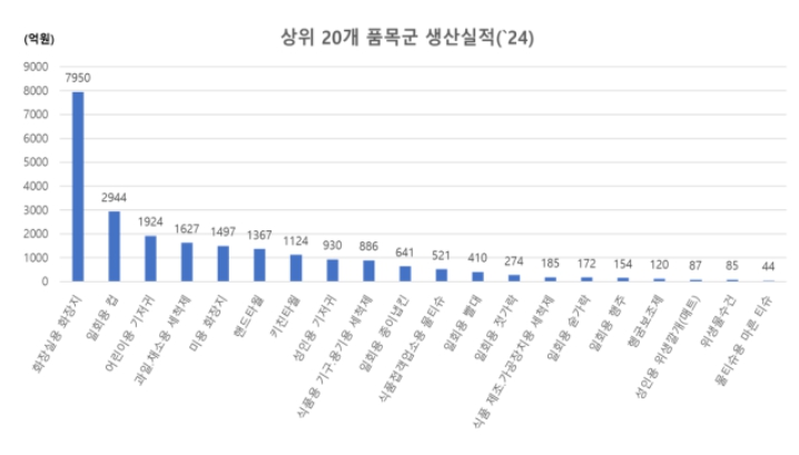 2024년 위생용품의 국내 생산액은 ▲화장지 9,447억 원(41.0%) ▲일회용 컵 2,944억 원(12.8%) ▲일회용 기저귀 2,941억 원(12.8%) ▲세척제 2,698억 원(11.7%) ▲일회용 타월 2,492억 원(10.8%) 순으로 높았으며, 해당 5개 품목이 전체 생산액의 약 89%를 차지했다.