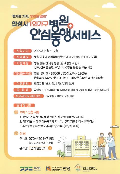 한편, 안성시는 병원 동행 서비스 외에도 정서 지원, 생활 돌봄, 사회관계망 회복 등 1인 가구의 안정적인 생활을 위한 다양한 정책을 지속 확대해 나가고 있다.