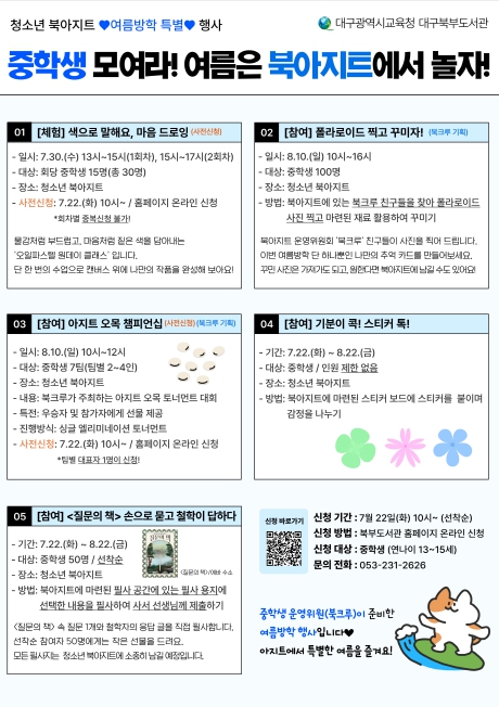 ‘북아지트’는 중학생들이 자유롭게 모여 독서와 문화 활동을 즐길 수 있는 도서관 내 공간으로, 이번 여름방학 행사는 또래 학생들의 관심을 반영하기 위해 이 공간의 중학생 운영위원으로 구성된‘북크루’가 직접 기획했다.