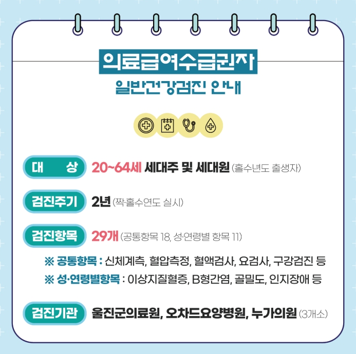 검진기관은 울진군의료원·오차드요양병원·누가의원이며, 검진을 받으면 소정의 기념품인 구급함을 받을 수 있다.