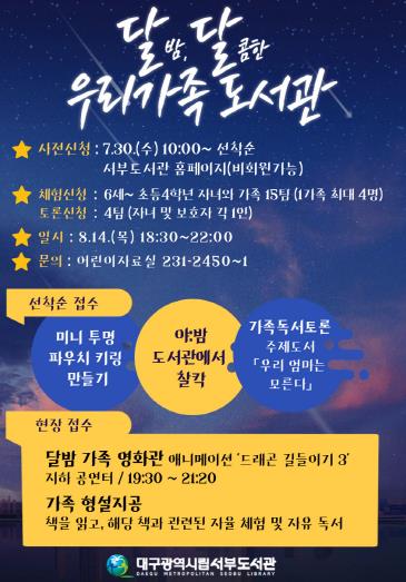 주요 체험 행사는 ▲가족독서토론, ▲가족 형설지공: 여름밤 책에 물들다, ▲미니 파우치 키링 만들기, ▲일 년중 오늘밤만: 야ː밤도서관에서 찰칵 등이며, 지하 1층 공연터에서는 ‘드래곤 길들이기3’영화를 상영한다.