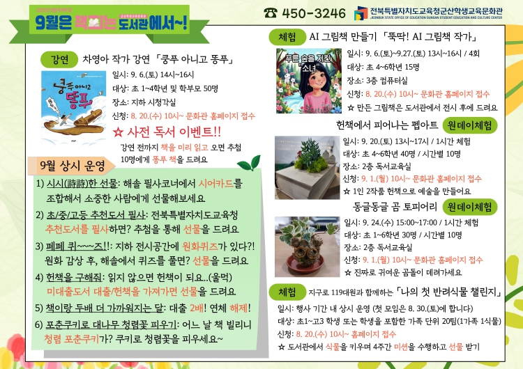 이 행사는 ‘9월은 책 피는 도서관(군산학생교육문화관)에서’를 주제로 강연과 체험 등 11개 프로그램을 선보일 예정이다.