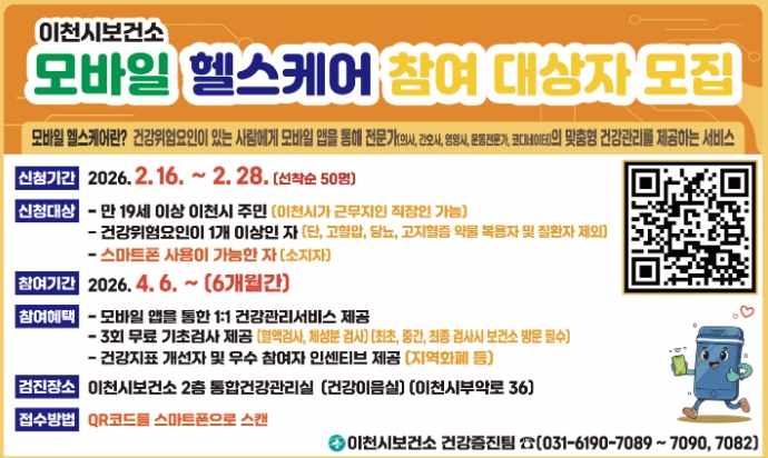 이천시보건소 관계자는 “모바일 헬스케어는 바쁜 현대인들이 일상에서 스스로 건강을 관리할 수 있는 최적의 서비스”라며, “만성질환 예방을 통해 시민들의 삶의 질이 향상되기를 기대하며 적극적인 참여를 바란다”라고 전했다.