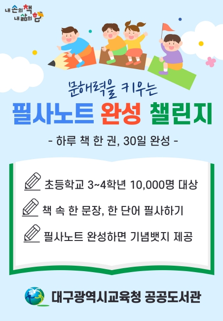초등 3~4학년 1만 명을 대상으로 공공도서관이 공동 제작한 ‘문해력을 키우는 필사노트’를 ‘하루 한 권, 30일 완성’을 목표로 완성하면 기념 뱃지를 증정한다.