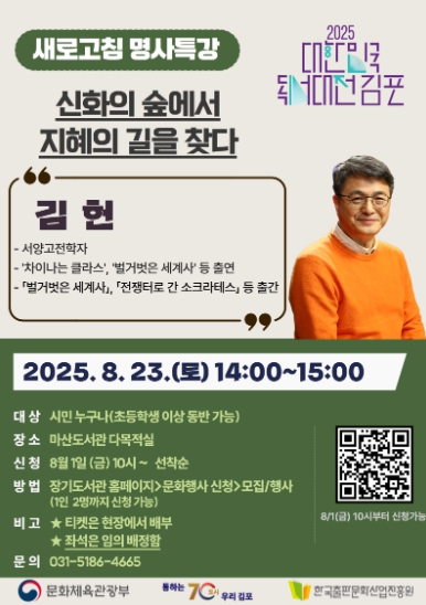 강연의 참가 신청은 8월 1일부터 김포시 도서관 홈페이지에서 선착순으로 진행된다.