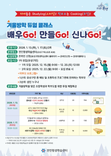 이번 특강은 방학을 맞아 학생은 학습·체험 활동을, 학부모는 간식 만들기 프로그램을 통해 자녀와 부모가 동시에 참여할 수 있도록 ‘듀얼 클래스’ 방식으로 마련됐다.