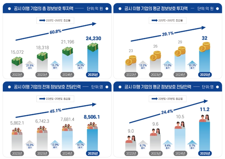 2025년 정보보호 투자액(2조 4,230억원)은 전년 대비(2조 1,196억원) 14.3% 증가했으며, 정보보호 전담인력(8,506.1명)은 전년 대비(7,681.4명) 10.7% 증가한 것으로 나타났다.