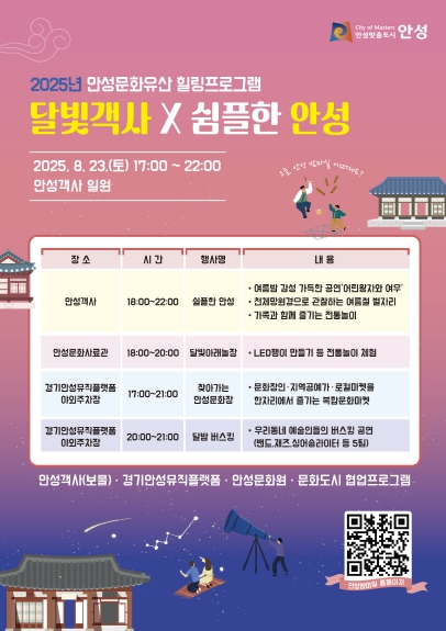 또한 안성문화사료관에서는 ‘달빛아래놀장’이라는 테마로 LED팽이 만들기 등 야간 전통놀이 체험이 운영되며, 오후 8시부터는 경기뮤직플랫폼 야외주차장에서 지역 예술인 5개 팀이 참여하는 ‘달밤 버스킹’이 펼쳐져 여름밤의 정취를 더할 예정이다.
