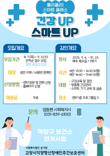 덕양구보건소 보건소 관계자는 “빠르게 변화하는 정보화 사회에서 정보 취약계층인 장애인이 생활 불편을 느끼지 않도록 양질의 스마트교육을 제공하고, 전문 의료기관을 통한 맞춤형 건강교육을 통해 지역 장애인의 일상생활 자립을 돕는 데 앞장서겠다”고 전했다.