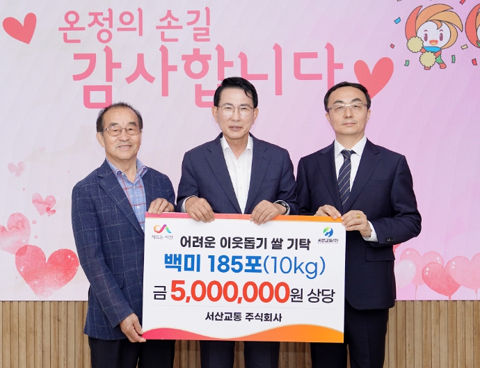 이완섭 서산시장은 “지역 발전에 기여하며 따뜻한 나눔을 실천해 주신 서산교통㈜에 감사드린다”라며 “기탁된 물품이 어려운 이웃에게 온정으로서 전달될 수 있도록 최선을 다하겠다”라고 말했다.
