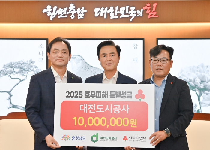 도는 11일 도청 외부접견실에서 태화홀딩스, 대전지방공인회계사회, 대전도시공사, 대한곡물협회충남지회가 호우 피해복구 지원 성금으로 1억 6800만원을 기탁했다고 밝혔다.