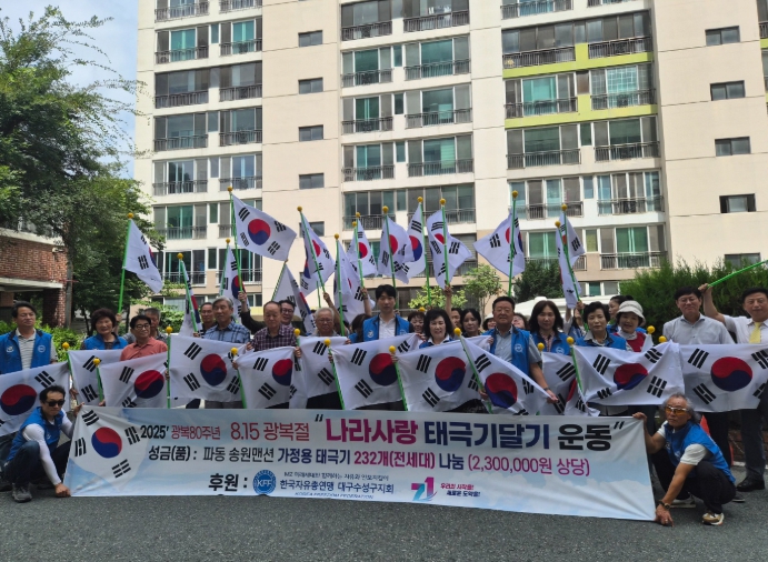 김대권 수성구청장은 “제80주년 광복절은 선열들의 희생과 헌신으로 되찾은 소중한 독립의 의미를 되새기고, 모두가 하나 되어 미래를 향해 나아가는 날”이라며 “태극기 달기 운동에 동참해 주신 구민 여러분께 감사드리며, 앞으로도 수성구가 나라 사랑 실천의 모범이 될 수 있도록 노력하겠다”고 말했다.
