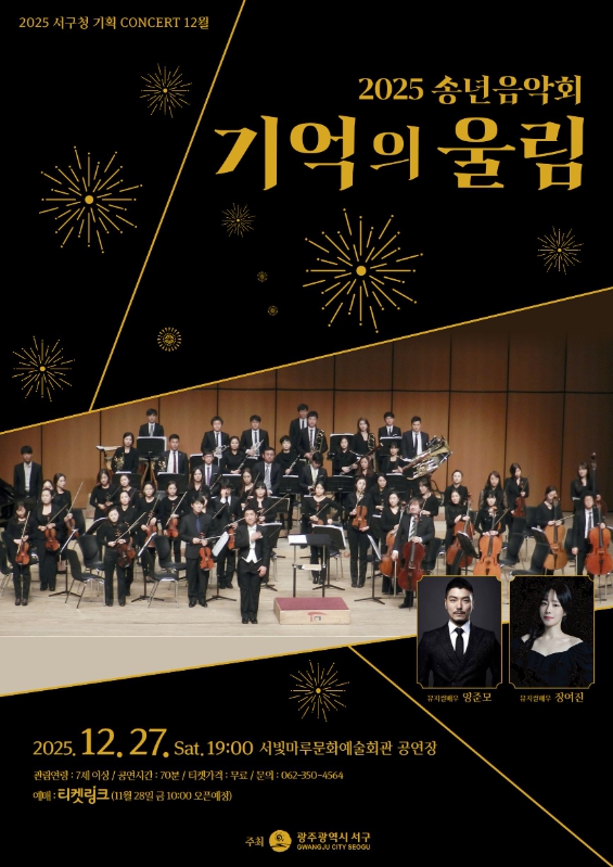 이번 음악회는 ‘격동의 2025년, 기억을 품고 되새기는 연대의 울림’을 주제로 ‘착한도시 서구’ 조성을 위해 한 해 동안 함께해 온 주민들에게 감사의 마음을 전하고 민주주의의 가치와 연대의 의미를 되새기기 위해 마련됐다. 정통 오케스트라와 국내 정상급 뮤지컬 배우, 성악가의 협연으로 깊이 있는 무대를 선보일 예정이다.