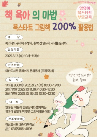 강사는 『책벌레의 비밀 응급실』의 저자이자, 유아 문해력 발달 전문가인 안성순 책놀이 강사가 맡아, 풍부한 연구 경험과 현장 사례를 바탕으로 실질적인 ‘책 육아’ 방법을 전달할 예정이다.