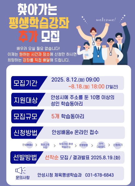안성시 관계자는 “찾아가는 평생학습강좌는 시민의 일상 가까이에서 학습 기회를 확장하는 맞춤형 교육 서비스”라며, “특히 이번 추가 모집은 기존에 신청하지 못했던 학습동아리나 새롭게 구성된 동아리에게 좋은 기회가 될 것으로 기대한다. 많은 관심과 참여를 바란다”고 말했다.