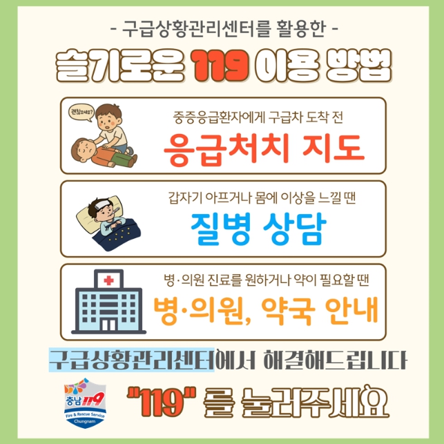 119구급상황관리센터는 24시간 운영되며, 중증 응급환자에게 구급차가 도착하기 전 필요한 응급처치 지도를 제공해 골든타임을 확보하는 데 중요한 역할을 하고 있다. 또한, 갑작스러운 통증이나 신체 이상 시 질병 상담을 지원하고, 병·의원 및 약국 위치 안내 서비스를 통해 시민들이 빠르고 정확하게 의료 서비스를 받을 수 있도록 돕는다.