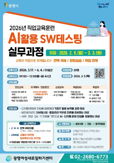 박승원 광명시장은 “AI 산업 확산으로 소프트웨어 품질 역량이 그 어느 때보다 중요해지고 있다”며 “광명의 여성들이 디지털 전문직으로 당당히 진출할 수 있도록 적극적인 지원과 환경 조성에 힘쓰겠다”고 밝혔다.