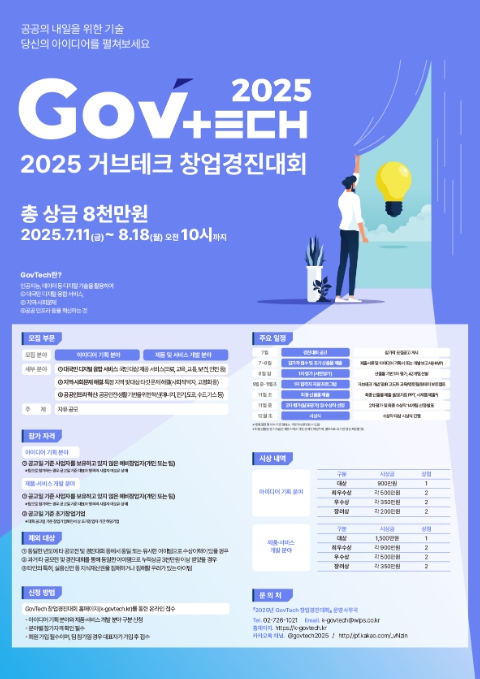 경진대회 추진 방향과 구체적 지원 내용, 과제 선정 절차 등 공모에 대한 자세한 내용은 '2025년 정부기술(GovTech) 창업경진대회' 운영사무국 및 '2025년 정부기술(GovTech) 창업경진대회' 누리집에서 확인할 수 있다.