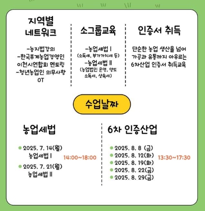1차 교육(7월 14일)은 농업 소득세 및 부가가치세 등 세금의 기본 개념을 중심으로 청년 농업인이 꼭 알아야 할 세법 기초를 다룬다. 2차 교육(7월 21일)은 농업법인의 운영 방식, 농업과 관련된 양도소득세, 상속·증여세 등 자산 이전과 관련된 세무를 주제로 더 전문적이고 실무적인 내용으로 구성된다.
