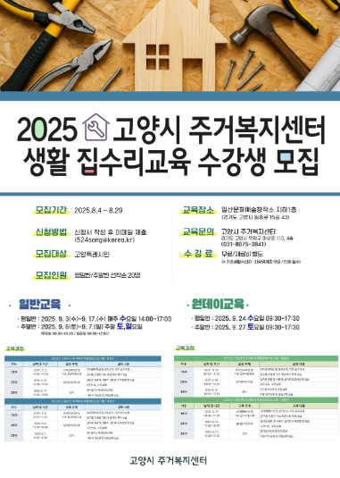 이번 교육은 시민들이 일상 속 간단한 집수리 기술을 익혀 주거환경을 스스로 개선할 수 있도록 돕기 위해 마련됐으며,‘2025년 경기도 주거복지사업 아이디어 공모’에서 고양시 주거복지센터 사업으로 선정됨에 따라 도비 지원을 받아 추진된다.