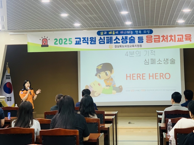 의성소방서 응급처치 교육 전문 소방관의 안내에 따라 응급처치의 필요성, 기도 폐쇄 대처 방법, 심폐소생술(CPR)과 자동심장충격기(AED)를 함께 운용 방법 등의 이론과 실습을 병행하여 진행됐으며, 실제 상황을 가정한 체험 중심 교육을 통해 교직원들은 실질적인 응급처치 기술을 익힐 수 있었다.