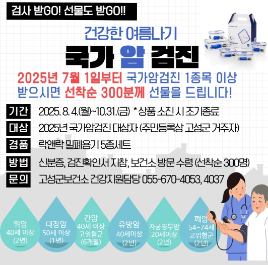 이번 이벤트는 2025년 7월 1일 이후 국가암검진 항목 중 1종 이상 검진을 완료한 군민을 대상으로 하며, 해당자는 신분증과 검진확인서를 지참해 고성군보건소에 방문하면 참여할 수 있다. 선착순 300명에게 소정의 기념품이 제공될 예정이다.