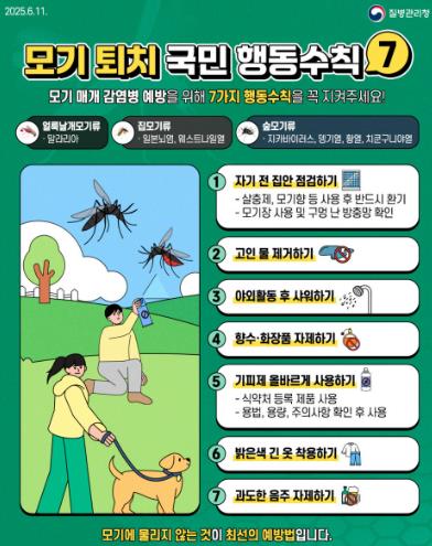 또한 모기가 활동하는 4월~10월까지 야외 활동 자제, 야간 외출 시 밝은색 및 긴 옷 착용, 진한 향수나 화장품 사용을 자제하고, 실내 모기 침입 예방을 위하여 방충망 정비와 모기장 사용을 권고했다.