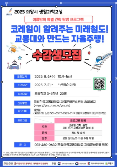 참가 신청은 다음 달 1일까지 선착순(초등학교 3~6학년 / 20명)으로 국립한국교통대학교 과학문화진흥센터 홈페이지에서 진행된다.