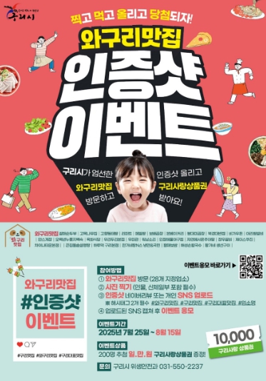 이번 이벤트는 위축된 지역경제로 어려움을 겪는 소상공인들에게 도움을 주고, 참여하는 시민들에게는 즐거움을 주기 위해 기획된 행사이다. 참여 방법은 구리시가 지정한 지역 대표 음식점 브랜드인 ‘와구리맛집’ 28개소 중 한 곳을 방문하여 음식이나 매장 사진을 해시태그와 함께 네이버 댓글이나 개인 SNS에 업로드하고, 네이버폼을 통해 응모 정보를 입력하면 된다.