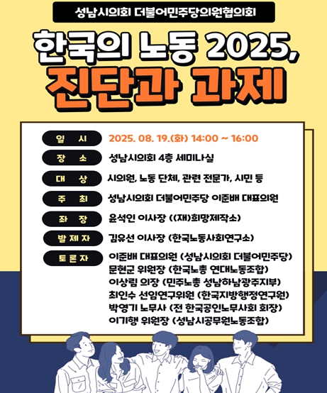 이어 ▲이준배 성남시의회 더불어민주당 대표의원 ▲문현군 한국노총 연대노동조합 위원장 ▲이상림 민주노총 성남하남광주지부 의장 ▲최인수 한국지방행정연구원 선임연구위원 ▲박영기 전 한국공인노무사회 회장 ▲이기행 성남시공무원노동조합 위원장이 토론자로 참여해, 현장의 목소리와 제도 개선 방향을 폭넓게 제안한다.