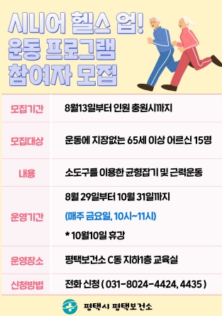 이번 운동 프로그램은 8월 29일부터 10월 31일까지 매주 금요일 오전 10시부터 11시, 총 8회로 평택보건소 C동 지하 1층 교육실에서 진행된다.