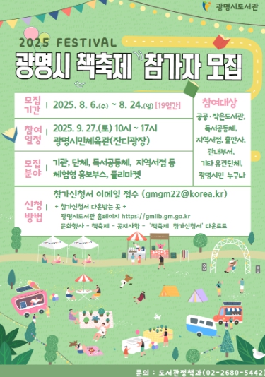 참가 대상은 공공도서관, 작은도서관, 독서공동체, 지역서점, 출판사, 관내 유관기관·단체, 광명시민 등 책과 문화를 주제로 축제에 참여하고자 하는 누구나 가능하다.