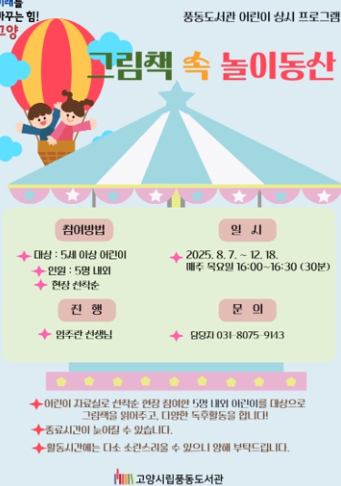 풍동도서관 담당자는“매주 목요일마다 상시 진행하는 만큼 많은 어린이들이 자유롭게 방문해 자연스럽게 책과 친해지는 즐거운 시간을 보냈으면 좋겠다”며 “이번 프로그램을 통해 아이들의 정서적 교감, 공감력, 사고력 향상 등 긍정적인인 영향을 미칠 것으로 기대된다”고 전했다.
