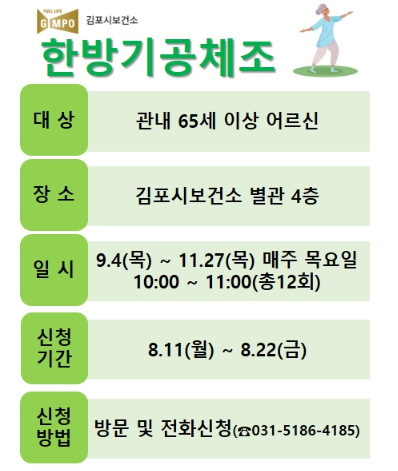 김포시보건소 관계자는 “9월부터 시작하는 한의약 기반의 체계적인 운동을 통해 어르신들의 건강 실천과 활력 회복에 좋은 기회가 되길 바라며, 많은 시민들의 관심과 참여를 바란다”라고 전했다.