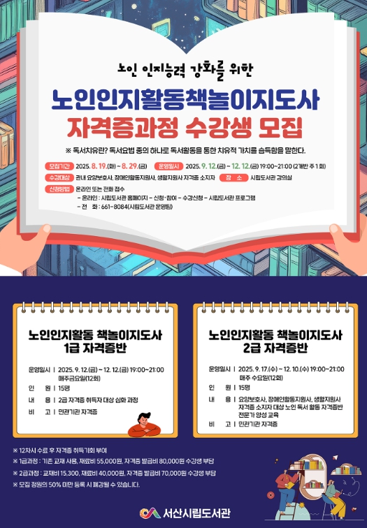 이번 교육은 노년기 인지 저하 예방 및 삶의 질 향상을 위해 독서 활동을 접목한 전문 프로그램으로,‘노인인지활동 책놀이지도사’민간자격증(1급·2급) 취득을 목표로 총 12주간 운영된다.