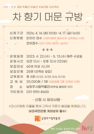 프로그램은 4월 22일부터 5월 13일까지 매주 수요일 오전 10시부터 오후 12시까지 총 4회 진행한다. 접수는 4월 14일부터 17일까지 시립박물관 누리집과 전화로 신청할 수 있다. 이번 사업은 KB금융그룹과 한국박물관협회가 추진하는 ‘전국 공립 박물관·미술관 무료관람 프로젝트’ 공모사업에 선정돼 전액 무료로 운영한다.