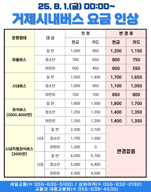 이번 요금 조정은 2020년 1월 이후 5년 7개월만으로, 지난 6월 결정된 경상남도의 “시내·농어촌버스 운임·요율 기준”에 따라 거제시를 포함한 도내 전역에서 시행되는 것이다.