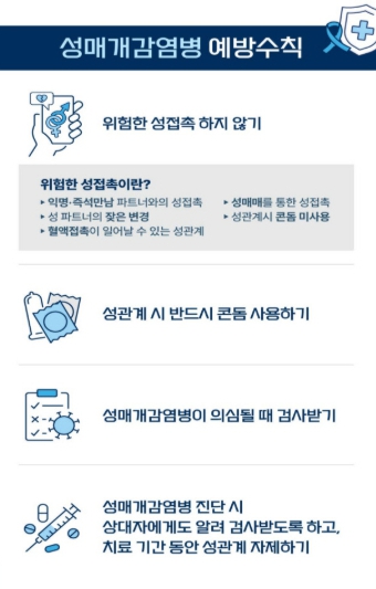 성매개감염병 예방수칙으로는 ▲ 위험한 성접촉 피하기(성매매, 다수의 파트너 등) ▲ 성관계 시, 반드시 콘돔 사용 ▲ 의심될 때, 즉시 보건소 방문해 검사 받기 ▲ 진단 시, 상대자에게 알리고 검사 권유 등이 있다.