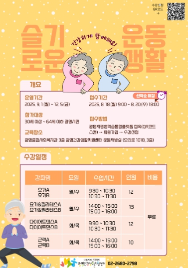 프로그램은 오는 9월 1일부터 12월 5일까지 운영하며, 요가, 요가·필라테스, 다이어트 댄스, 근력운동 등으로 구성해 다양한 신체활동을 경험할 수 있다.