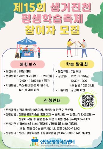형인경 군 평생학습센터 주무관은 “생거진천 평생학습축제는 진천군민 누구나 함께 배우고 나누며 즐기고 체험할 수 있는 기회”라며 “많은 기관과 단체, 학습동아리의 적극적인 참여를 기대한다”고 밝혔다.