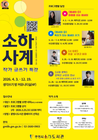 ‘소하사계’는 4월부터 12월까지 계절별로 시 창작, 에세이 쓰기 등 다양한 주제로 진행하는 글쓰기 강좌다. 현직 전문 작가가 강의를 맡으며, 각 강좌는 4주 과정으로 구성한다.