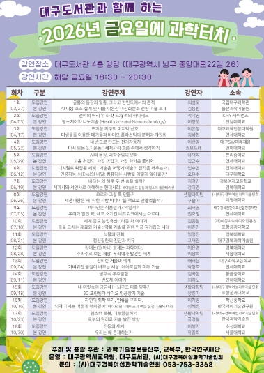 이번 프로그램은 오는 3월 27일부터 10월 30일까지 매주 금요일(18:30~20:30) 총 18회에 걸쳐 대구도서관 강당에서 진행된다. 강연은 일상 속 과학 원리를 이해할 수 있는 도입 강연과 최신 연구 성과를 소개하는 본 강연으로 구성된다.