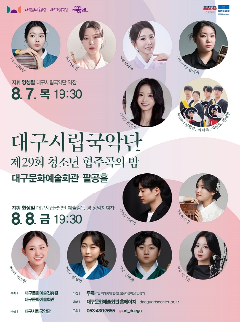 대구시립국악단 제29회 '청소년 협주곡의 밤' 입장료는 무료이며, 대구문화예술회관 누리집을 통해 예매할 수 있다.