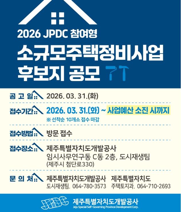 ‘JPDC참여형 소규모주택정비사업 후보지 발굴 공모’에 대한 자세한 사항은 제주개발공사 홈페이지 내 공지사항에서 확인할 수 있다.
