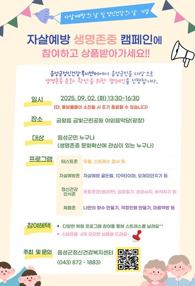 음성군정신건강복지센터 이강표 센터장은 “이번 행사를 통해 자살예방에 대한 지역사회의 관심을 높이고, 음성군민 모두가 함께 생명을 지키는 문화를 만들어가길 바란다”며, “앞으로도 지속적인 생명존중 활동과 정신건강 증진사업을 펼쳐 나가겠다”라고 말했다.