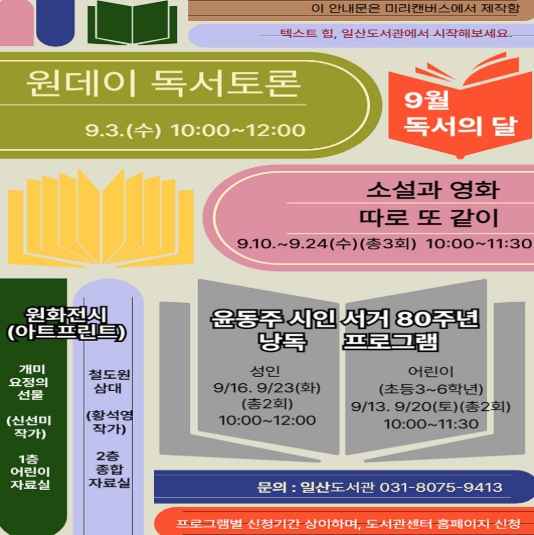 먼저 9월 3일 수요일 노벨문학상 수상 작가 작품을 함께 읽고 토론하는 '원데이 독서토론'을 시작으로, '소설과 영화, 따로 또 같이', '윤동주를 읽다, 나를 듣다.', '윤동주 동시, 마음으로 읽는 시','함께 필사_윤동주 시(詩)','원화전시'등을 운영한다.